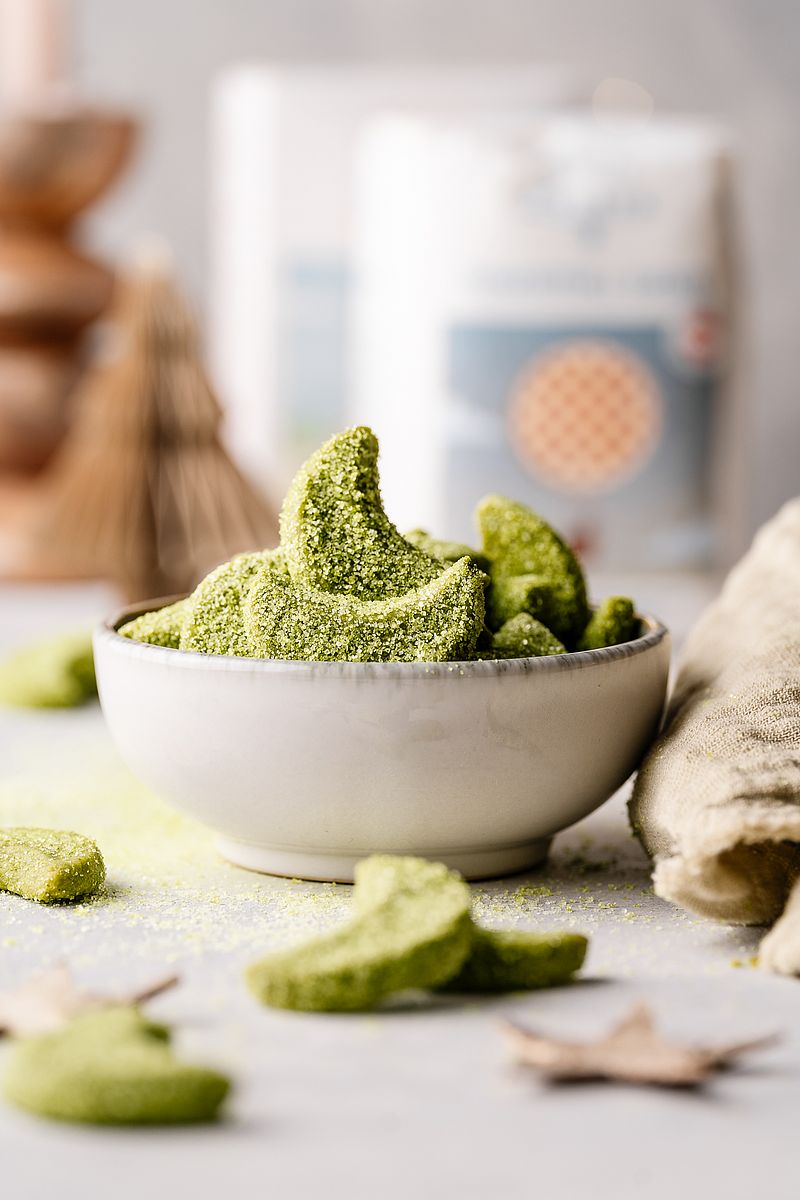 Pečene rogljičke pustite 1–2 minuti, da se rahlo ohladijo, nato pa jih še tople povaljajte v mešanici sladkorja in matche.