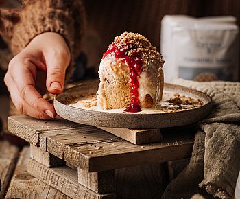 Skutna torta s piškoti speculaas, marcipanom in brusnicami
