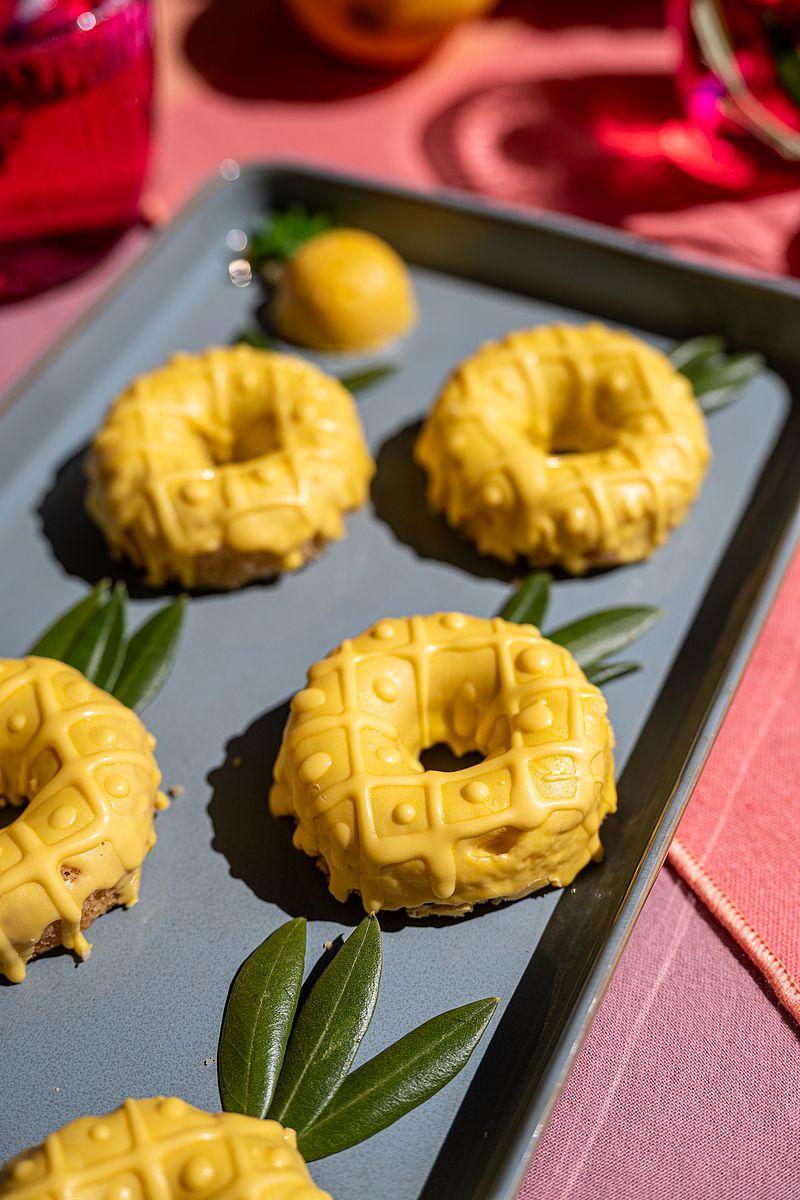 Preostalo čokolado dajte v vrečko, odrežite konico in narišite mrežo na krofe. Na koncu v kvadrate dodajte majhne pikice. Postrezite z listi ananasa.